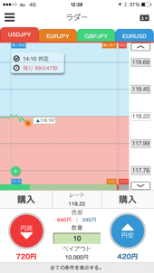 トレイダーズ証券がみんなのバイナリーとは別に、新たにサービスを開始した「みんなのオプション」。取引画面はひとつにすっきりとまとめられて見やすく、タブのタップやスライドで別の通貨の画面へサクサク推移できるのが快適です。