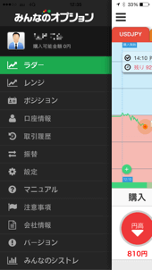左上のアイコンからメニュー画面を開き、ここからラダーとレンジの変更、ポジションや履歴、資金の振替といった操作が行えます。「設定」では取引時における購入内容確認の表示を省略したり、各通貨ペアにおいて発注時の初期ロット数を指定しておけます。「みんなのシストレ」アプリ起動もここから。