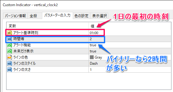 バイナリーの時間に合わせて縦線が出ます