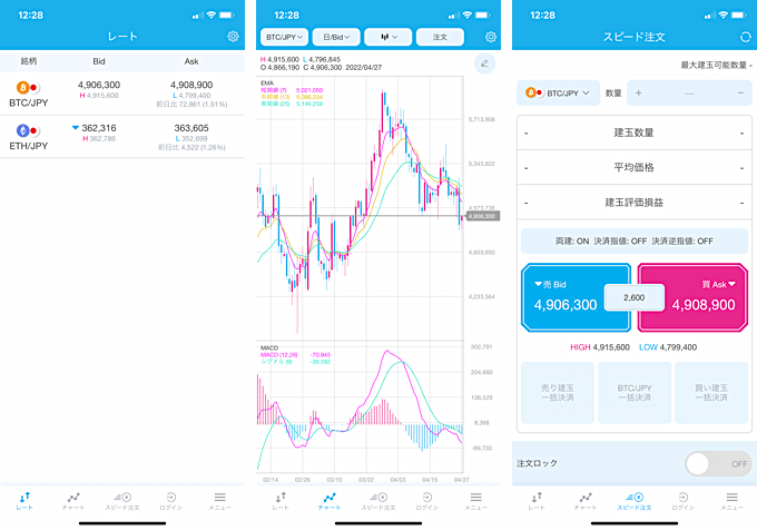 ビットコイン/円、イーサリアム/円、リップル/円、ビットコインキャッシュ/円、ライトコイン/円の取引が可能です。