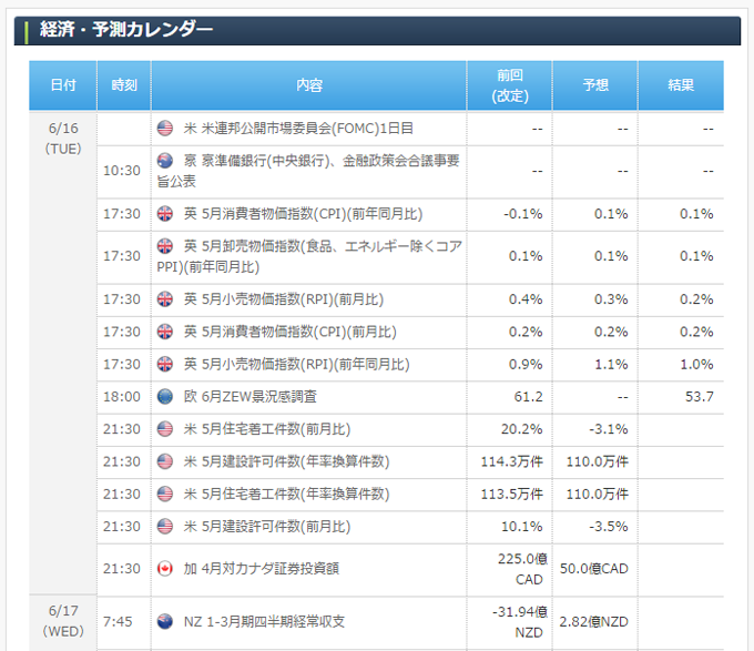 メジャー通貨の国のみなので、シンプルで見やすいです。ただ月ベースで掲載されているので当日分を見つけるのにスクロールが必要になります。