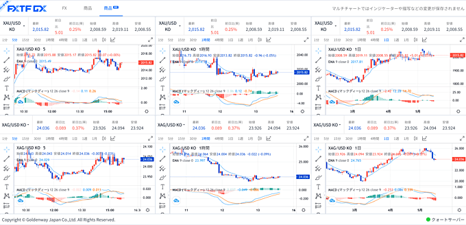 上記画像は、実際にFXTF GXのTradingViewチャートを6分割表示させて、金・銀のノックアウトオプション銘柄を並べた画面です。