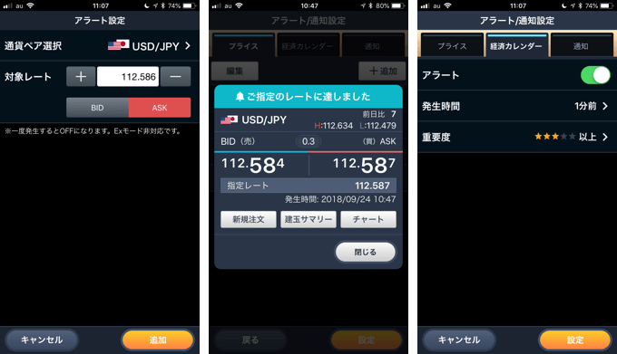 プライスアラートと経済カレンダーアラートは従来アプリに続き、GMOクリック FXneoにも搭載されています。対象レートを入力しておけば、上記画像のように分かりやすくお知らせしてくれます。