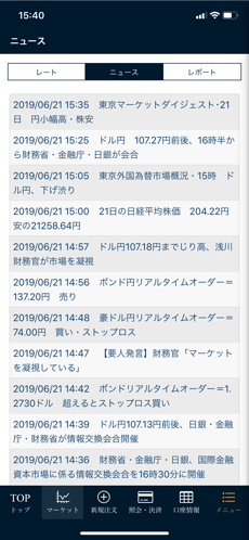 この画面では、閲覧したニュースの見出しがやや黒くなるのが親切で、左右へのスライドによりレポート、経済指標の画面へ推移できるのが便利。