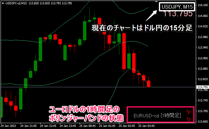全て赤色ということは移動平均線は下落しています。1時間足は収束、4時間足はアッパーバンドとロワーバンドも下落、日足は拡散している状態です。