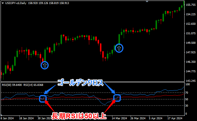 • 長期RSIが50以上、短期RSIと長期RSIのゴールデンクロスで上矢印