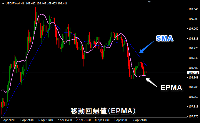 エンドポイント移動平均(EPMA)または線形回帰指標(LRI)とも言われてます。期間の価格を回帰分析したものです。価格との追随性が高いです。