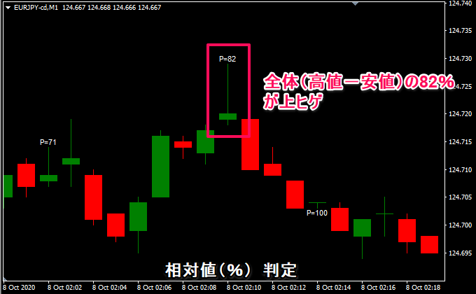 ローソク足全体(高値-安値)の何パーセントがヒゲになっているかを判定基準にしています。
