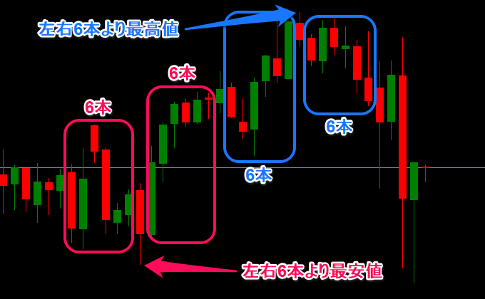 逆に、左6本と右6本を比べていちばん安値が低いローソク足がスイングロー(最安値)となります。