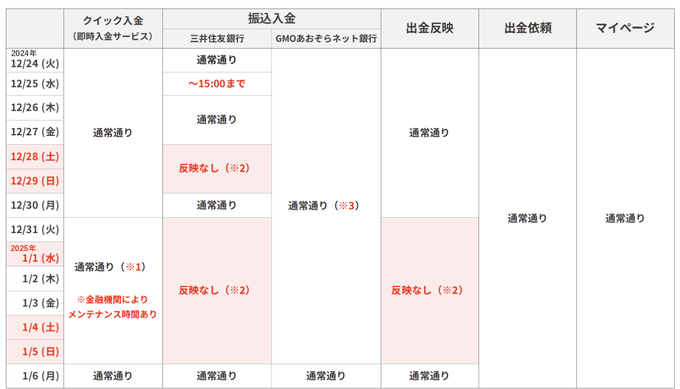 GMOクリック証券の年末年始の入出金に関しては、即時入金サービスは通常通り利用可能です。