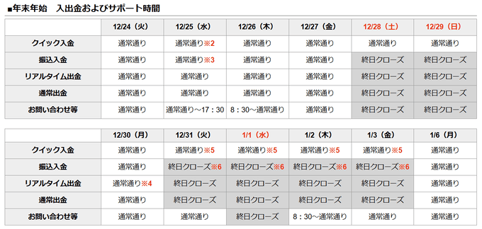 入出金に関しては、クイック入金の場合、12月30日9時00分以降に反映が失敗すると1月6日の反映となります。