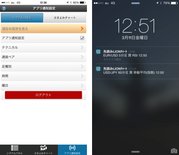 さきよみLIONチャートのスマホ版はプッシュ通知機能に対応。シグナルパネルではテクニカルや足種を自分で指定、さきよみチャートについては予測される値動きの形などを指定して、自分に合った設定をしたうえで通知を受け取れます。