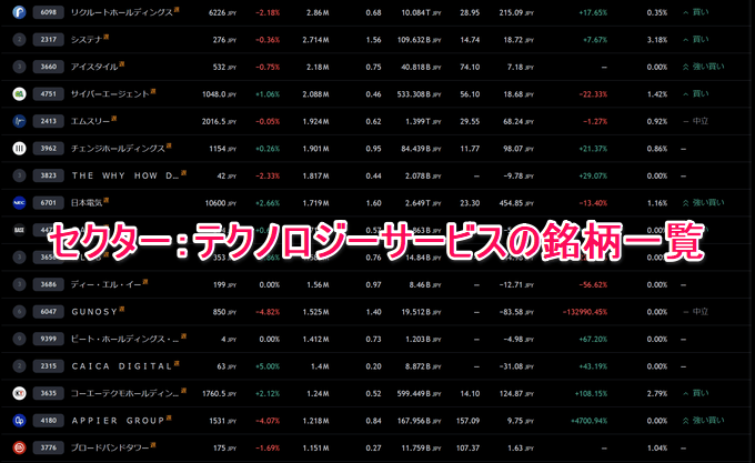 ここではNECを含むテクノロジーサービスの銘柄一覧が表示されます。同じセクターでより良い銘柄を厳選するときに便利です。