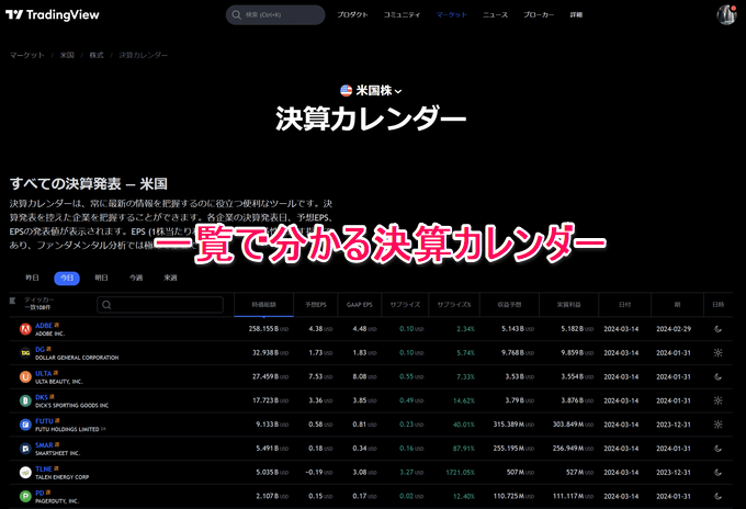 トレーディングビューには世界各国の株式銘柄の決算日が確認できるカレンダーがあります。