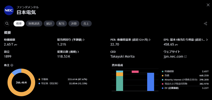 上記はNECの概要ページです。時価総額、配当利回り、PER、EPSといった基本的な情報がまとまっています。