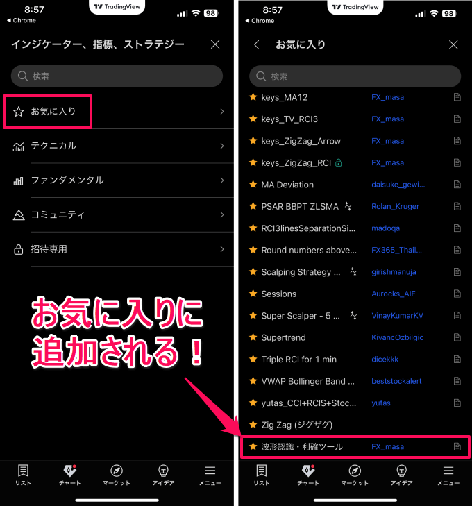 少し分かりにくいですが、これでインジケーターがお気に入りに追加されます。