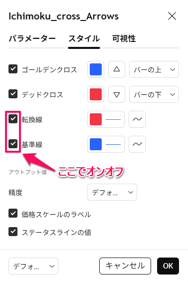- 【TV ver1.0】 一目均衡表の転換線と基準値のクロスでサイン表示するインジケーター