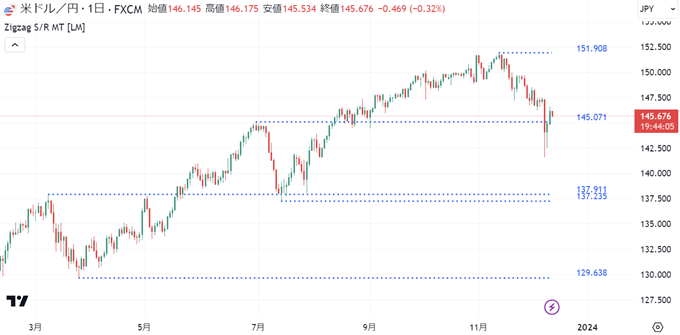 高値から直近の安値はどこか、さらにもう一つ前の安値はどこかを確認するときに便利です。
